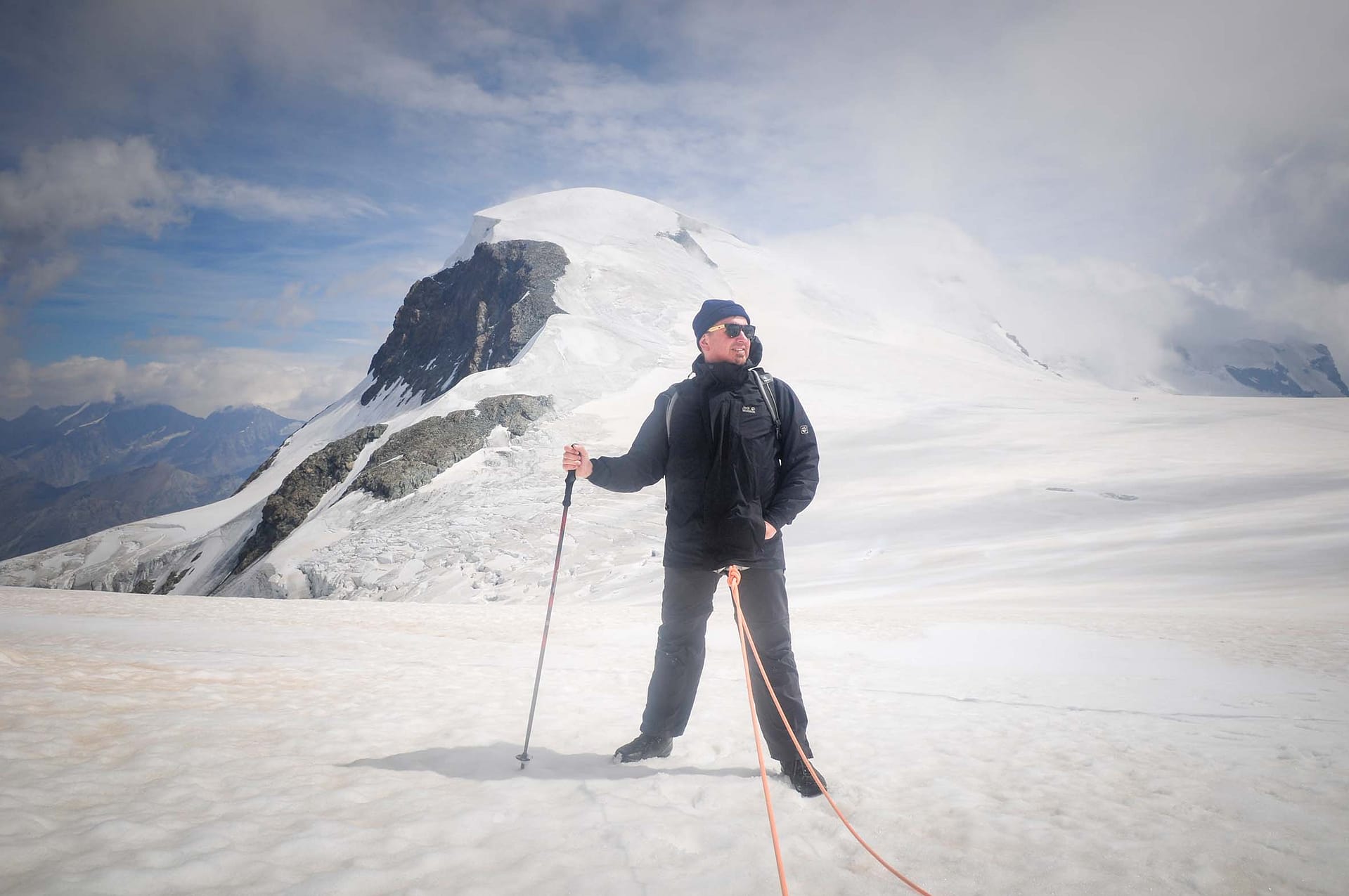 Im Gebiet rund um Zermatt in der Schweiz habe ich mich auf die Höhe vorbereitet, mich akklimatisiert. Kondition ist vorhanden und Höhenluft kann ich vertragen, ich habe Erfahrung mit dem Gehen auf Gletschern und im hochalpinen Gelände. Und ich weiß – wenn´s doch nicht geht, dann dreh um. Vielleicht ist die letzte Erfahrung die wichtigste. In Zermatt, dem Ort gelegen am Fuß vom Matterhorn und eben auch dem Breithorn, fand ich mit Denis Gruber einen Bergführer, der mich mitnimmt. Denn für Laien, also Leute wie mich, gilt, es niemals allein zu versuchen. Auch, weil es über Gletscher geht. Respekt sollte man vor jedem Berg haben, die Welt dort oben aber ist eine ganz andere.