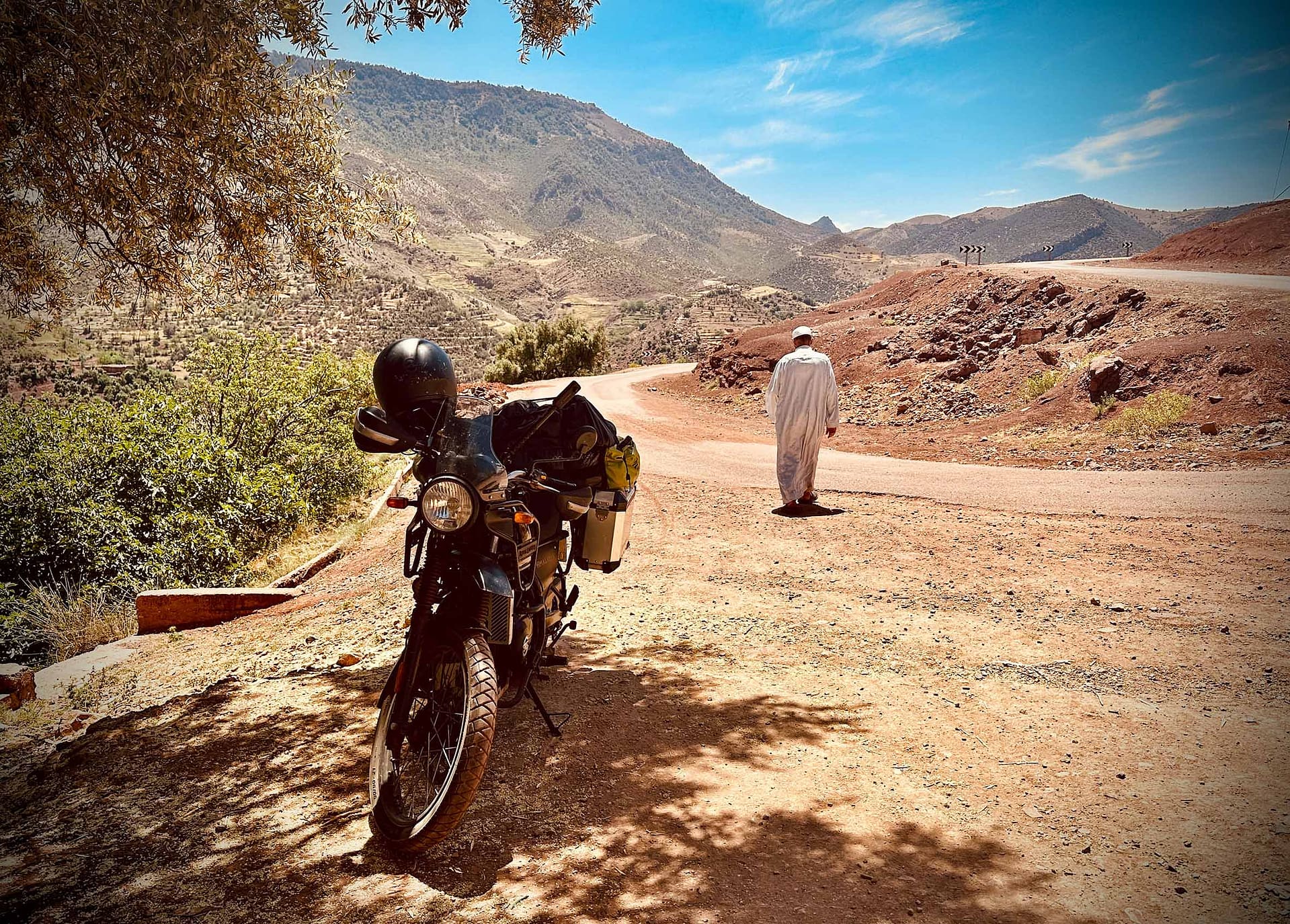 Die Himalayan nimmt die Steigung mit stoischer Ruhe, fast könnte man meinen, ihre indische Heimat habe im Hohen Atlas einen nahen, lieben Verwandten getroffen. Das hier ist ihr Element, hier zieht sie Meter für Meter voran, tuckert vor sich hin und mahnt nur durch Fahrwerksschwankungen zu langsamerer Gangart, gut, ok, das könnte man auch elektronisch regeln, aber nicht mit ihr, die Himalayan will ehrlich sein. So ehrlich wie der alte Mann auf dem Esel vielleicht, der noch Stunden unterwegs sein wird in der Einsamkeit, oder die zwei Frauen, die gleich eine ganze Bande von Eseln vor sich her treiben, das ist hier immer noch das Lastenrad, oftmals die einzige Möglichkeit, Dinge des Lebens zu transportieren.