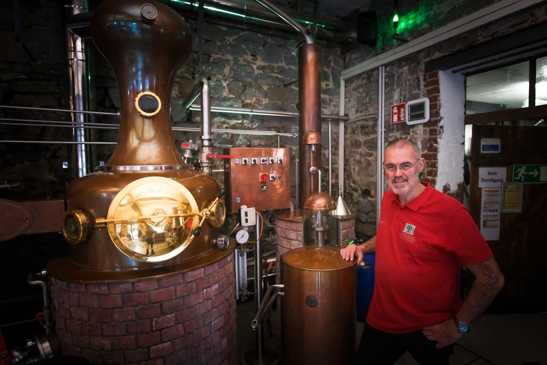 Die Manufaktur liegt in einem engen Seitental der Volme. In dem hohen, hellen Raum (einer ehemaligen Schmiede) mit offenem Ziegelstein steht das Herz des Betriebes – die kupferne Brennblase, die Brennanlage. Hier steht auch Flasche um Flasche in den Regalen und auf den Tischen – Gin und Rum beispielsweise sowie Whisky und Obstbrand – und an den Wänden hängen all die Auszeichnungen, die sie für manchen Hochprozentigen schon bekommen haben. Masterdistiller Klaus Wurm bietet auch Tastings, „Schwarzbrennerseminare“ und Brennereiführungen an.