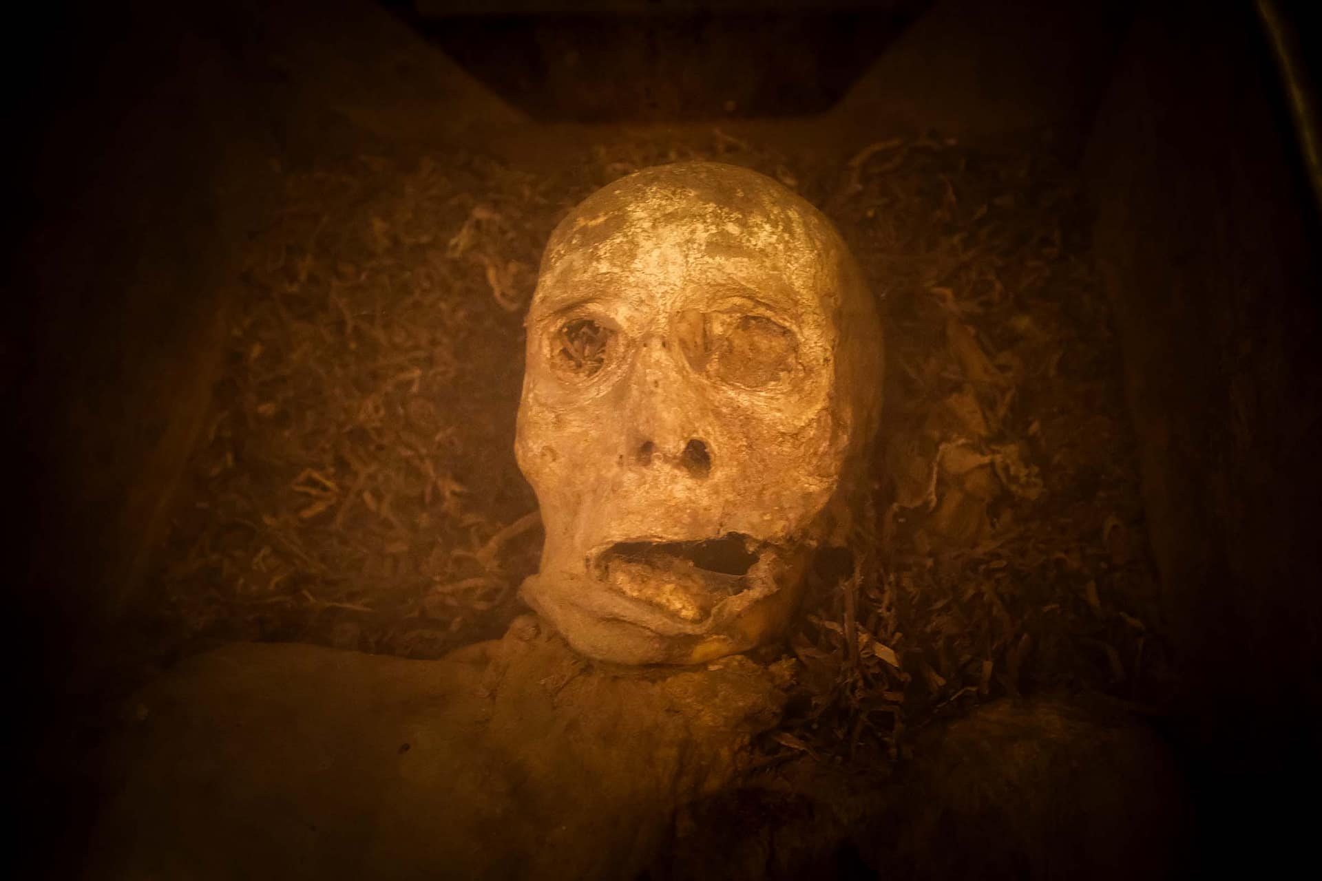 Eine Mumie hat noch ein paar Zähne, und sie hat Staub im Mund. Ihre Arme sind über dem Bauch verschränkt. Sie scheint keinen Hals zu haben, der Kopf liegt auf der Schulter, sie hat sehr lange Beine und ist nur noch eine Hülle. Der Mund liegt schief und offen, wie zu einem stummen Schrei aufgerissen und scheint vom Schmerz verzerrt. Das ist gruselig, und es ist ziemlich selten, dass sich solche Mumien erhalten haben, dass sie zu besichtigen sind. Wie kommt das?