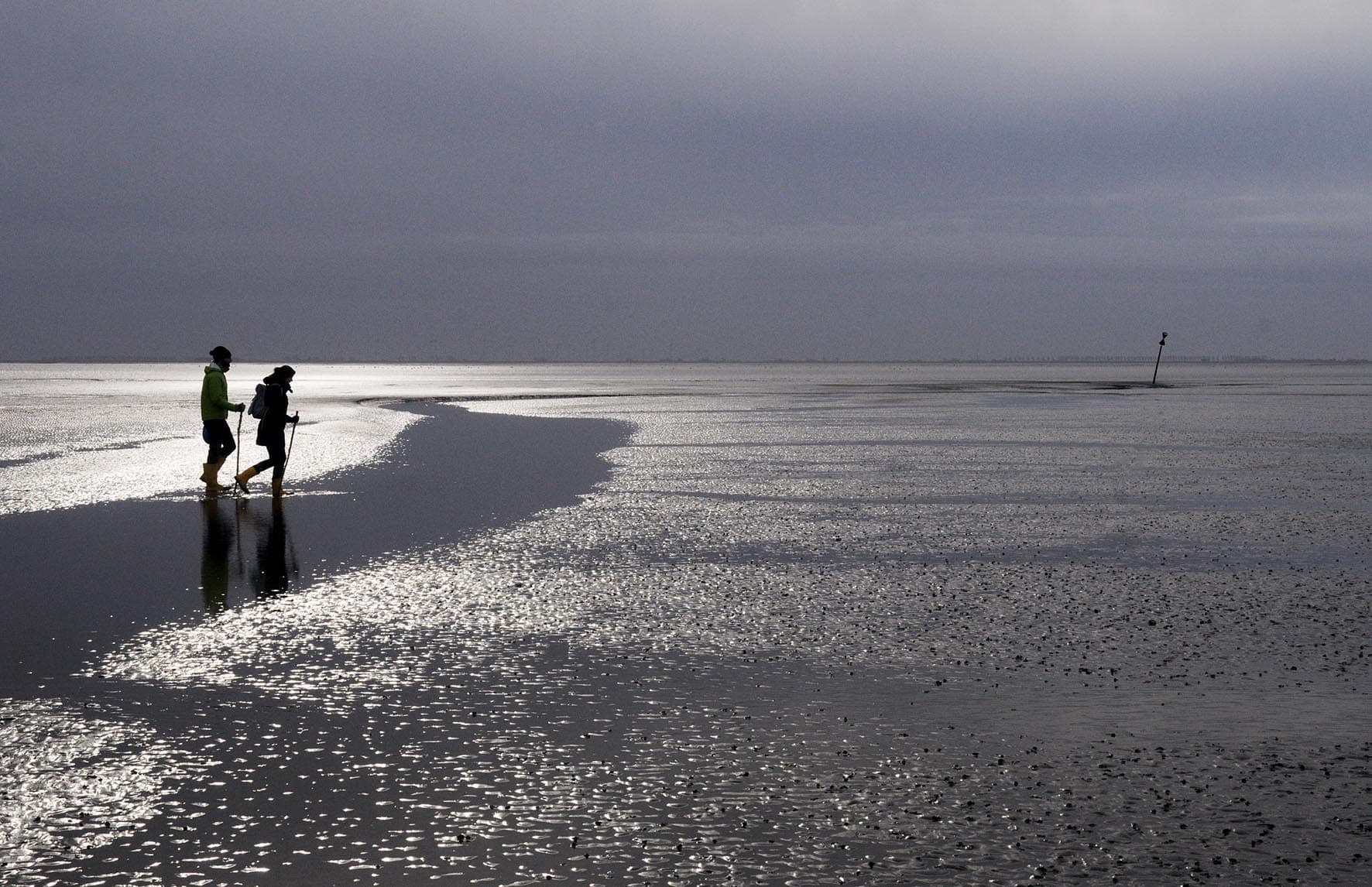 Auch auf dieser winterlichen Wattwanderung gilt – das gemütliche Aufwärmen samt kulinarischem Ausklang rundet den Ausflug ab. Lichtfinger greifen auf das zunehmend trockenfallende Watt in der Meldorfer Bucht, verbliebene Wasserflächen gleißen auf und unterstreichen das düster Dramatische des Himmels. Diese Bucht liegt südlich von Büsum und an der Badestelle Nordermeldorf steigt die Gruppe ein. Über dem Watt und seinem gefühlt endlosen Raum liegt eine tiefe Ruhe, sie überträgt sich auf den Besucher, erst recht, wenn die Schritte den Rhythmus gefunden haben.