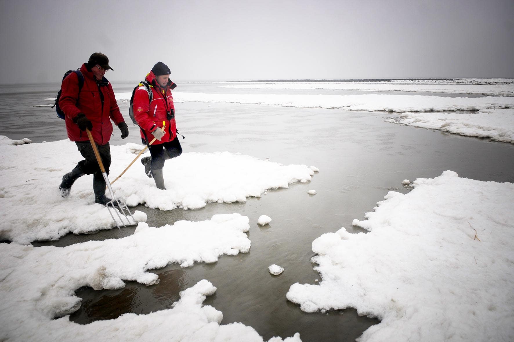 Nationalpark-Wattführer Johann-Peter „Jan“ Franzen (L.) ist mit Michael Wieben im Schnee unterwegs. Foto: Oliver Abraham
